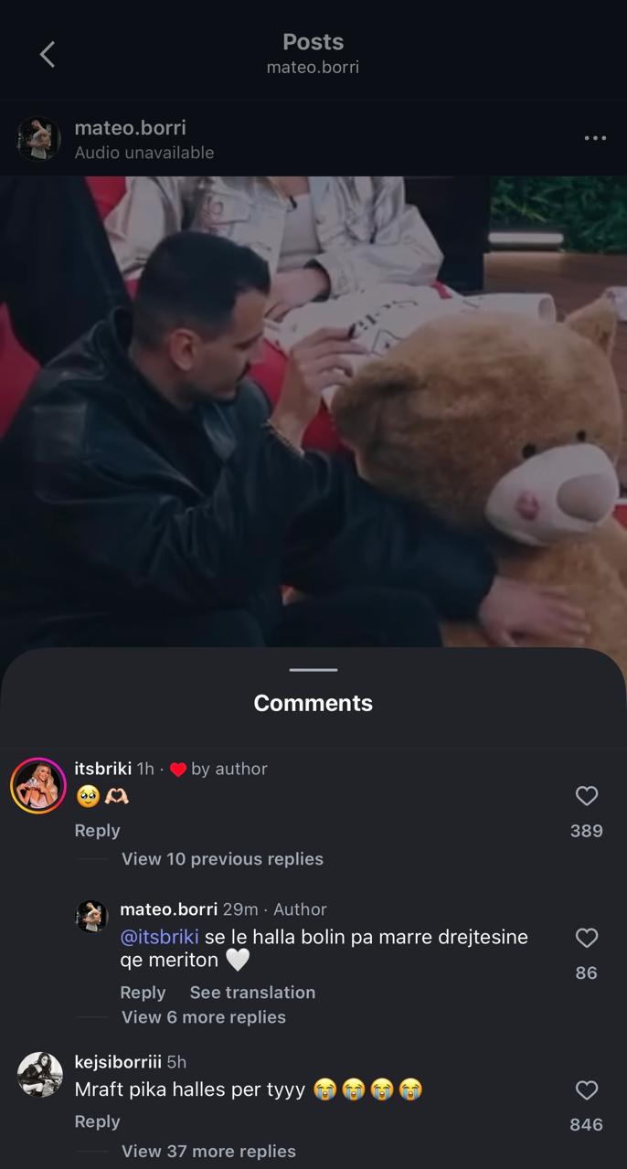 Gjithçka nisi në llogarinë zyrtare të Mateos në Instagram, ku familja e Brikenës (e cila menaxhon faqen e saj) la fillimisht një koment me emoji zemër.