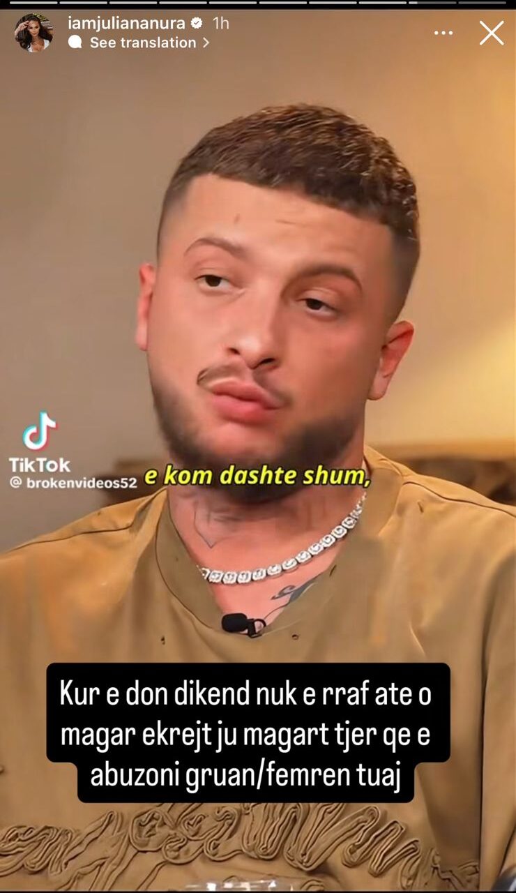 Por menjëherë pas publikimit të intervistës, ka ardhur një reagim i fortë nga Juliana Nura, e cila ka shpërthyer kundër çdo forme dhune ndaj grave. Në një postim në Instastory, ajo ndau një pjesë nga intervista e Feros, duke shkruar me tone të ashpra: