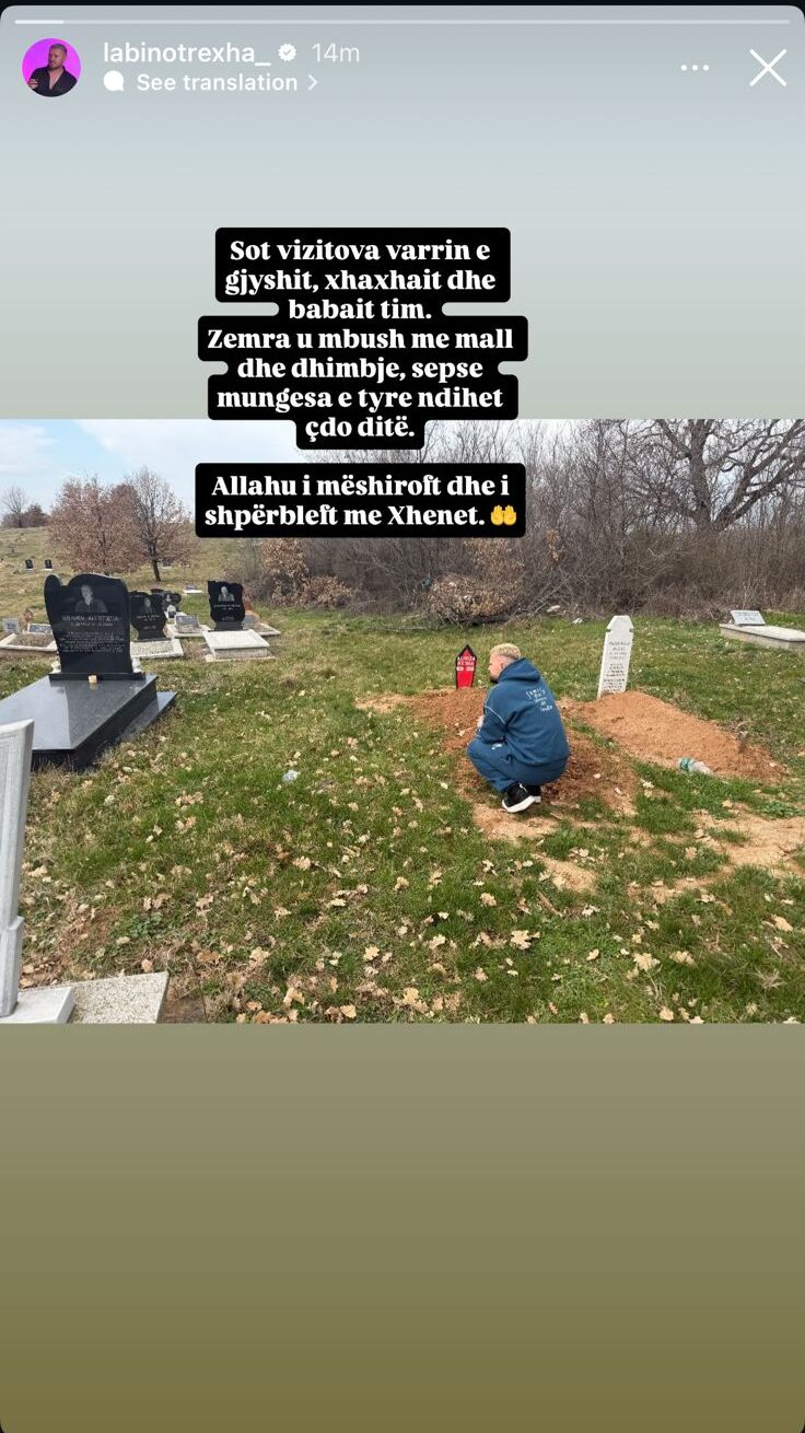 Krahas imazhit, këngëtari bëri një dedikim tejet emocionues, ku shprehu dhimbjen dhe mallin e pamasë: “Sot vizitova varrin e gjyshit, xhaxhait dhe babait tim. Zemra u mbush me mall dhe dhimbje, sepse mungesa e tyre ndihet çdo ditë. Allahu i mëshiroftë dhe i shpërbleftë me Xhenet.”