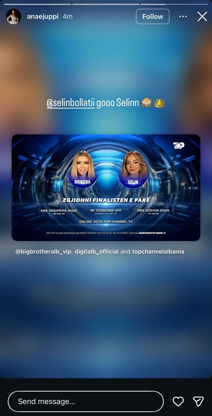 Së fundmi, ish-banorja e “Big Brother VIP Kosova 3”, Ana Ejupi, ka ndarë me ndjekësit e saj në Instagram se kë mbështet në këtë sfidë vendimtare.