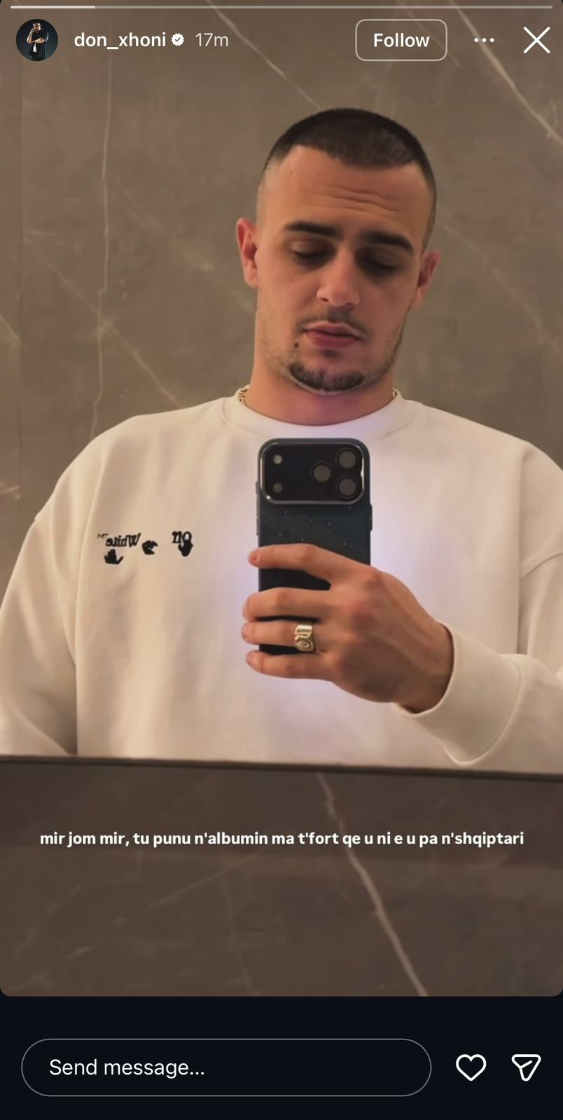Në një video të postuar së fundmi në Story, artisti shfaqet mjaft i fokusuar dhe i vendosur për atë që po përgatit. Përveç pamjes, ajo që ka marrë vëmendjen kryesore është mbishkrimi i tij goditës.