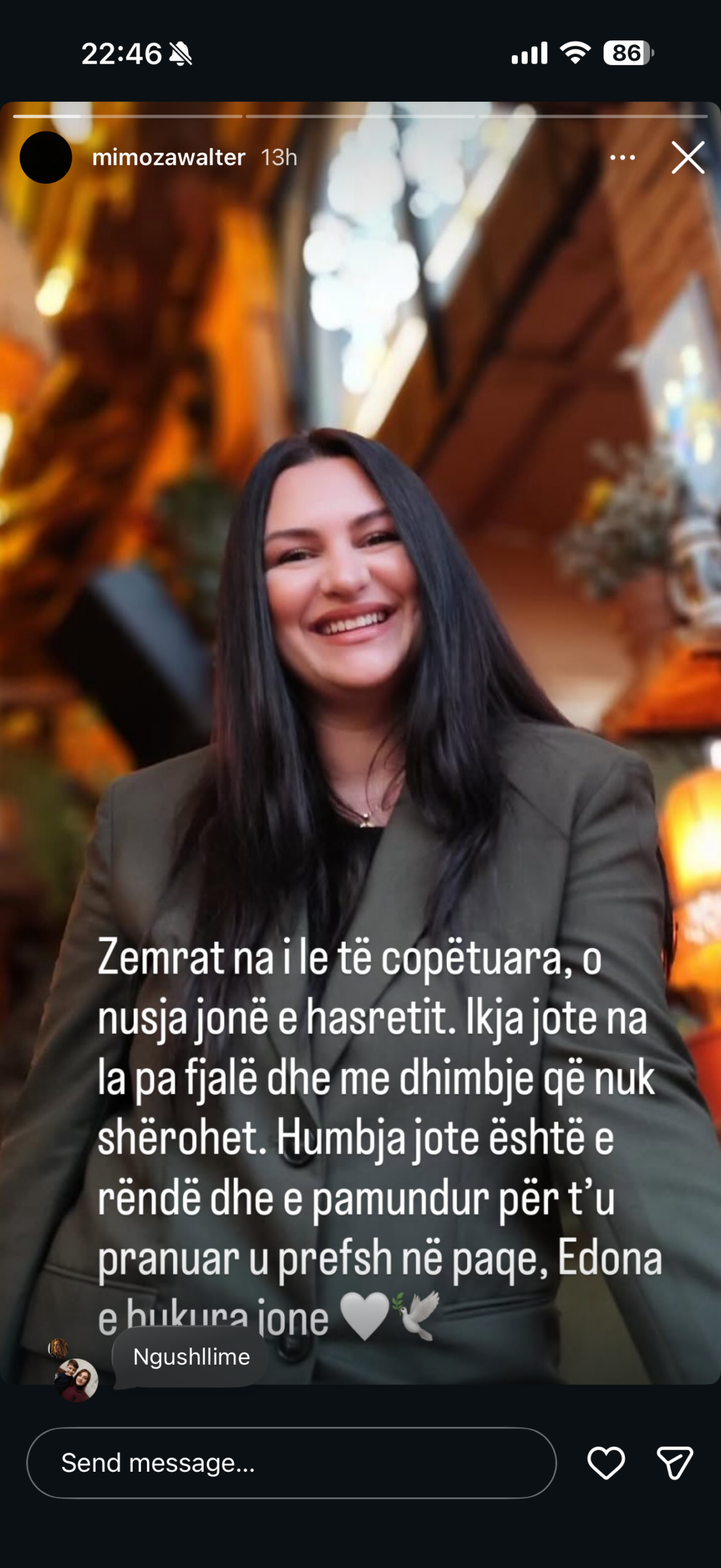 Përmes disa postimeve në Instagram, Mimoza ka shprehur tronditjen për këtë humbje të papritur, duke e quajtur Edonën “motër”.