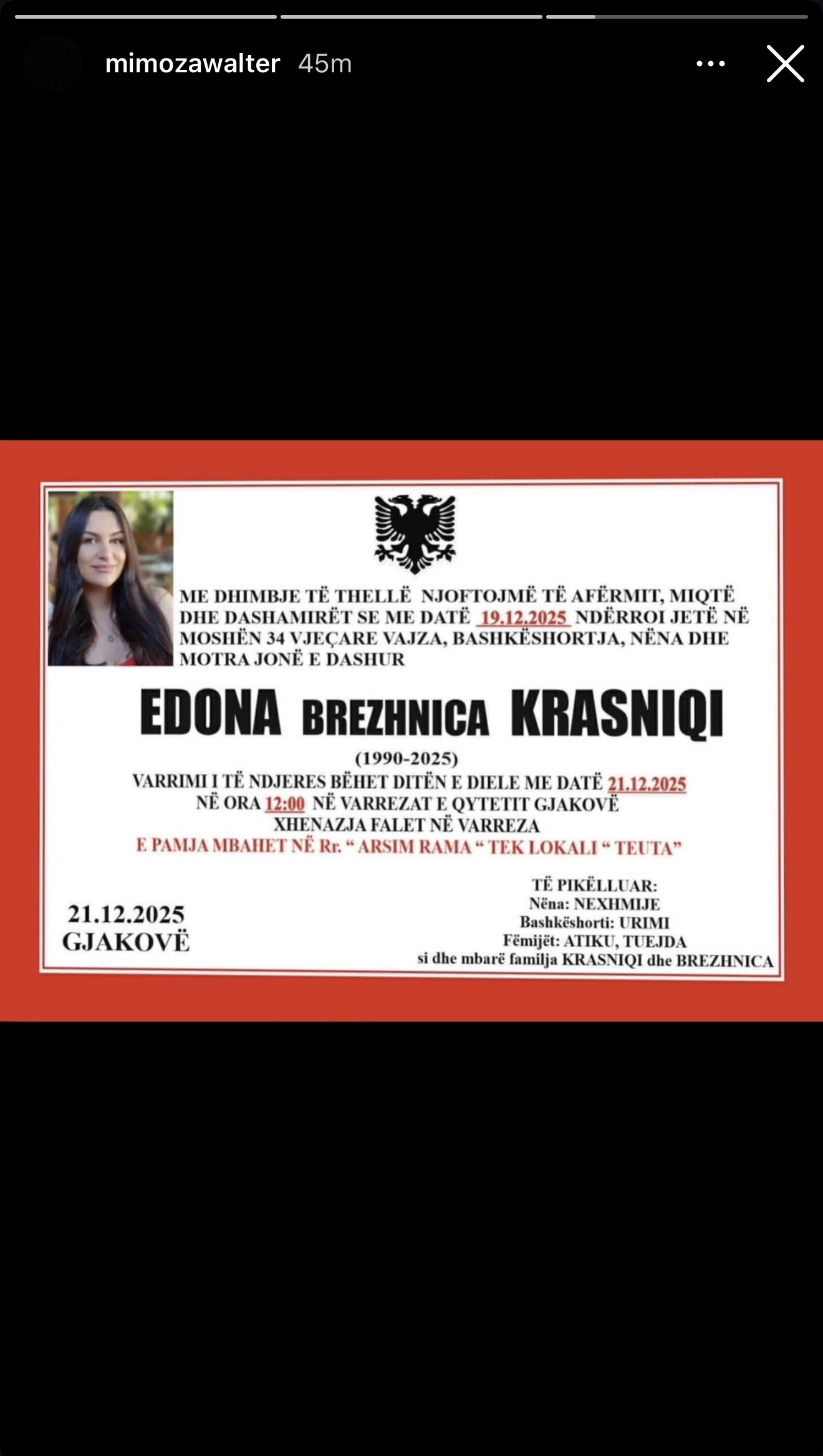 Një lajm i hidhur ka tronditur sot familjarët dhe miqtë e Edona Brezhnica Krasniqit, e cila është ndarë nga jeta parakohe në një moshë fare të re. E ndjera, me origjinë nga Mitrovica, ka mbyllur sytë përgjithmonë duke lënë pas dhimbje të madhe.