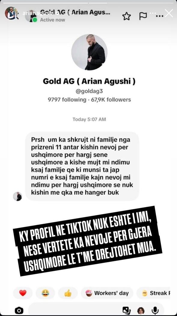 Në një “InstaStory”, këngëtari ka shpërndarë një pamje (screenshot) të një bisede ku një qytetar i ishte drejtuar kësaj llogarie false në TikTok. Në mesazh, personi kërkonte ndihmë emergjente për një familje me 11 anëtarë nga Prizreni, të cilët ndodheshin në kushte të rënda ekonomike dhe kishin nevojë për gjëra ushqimore.
