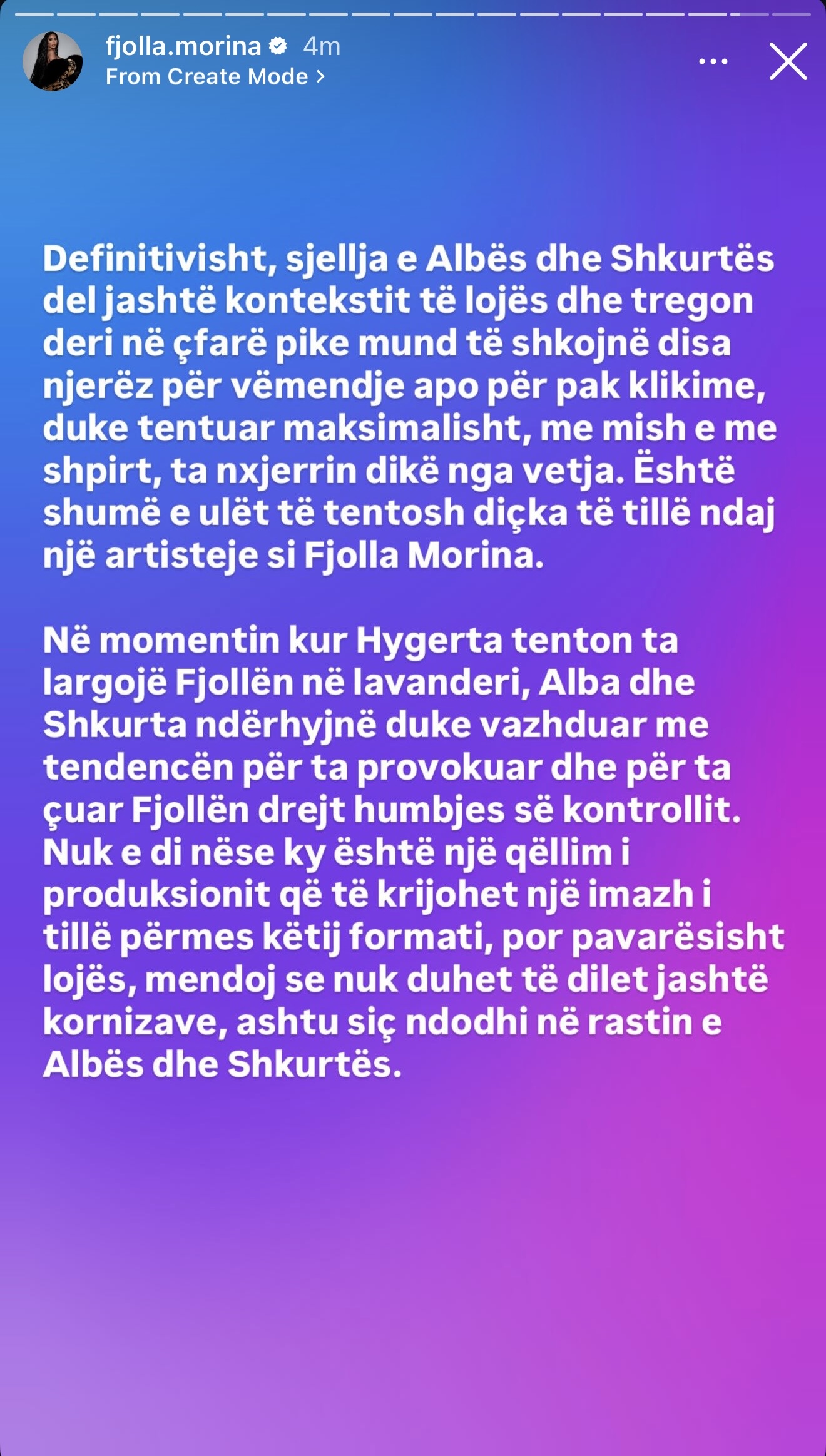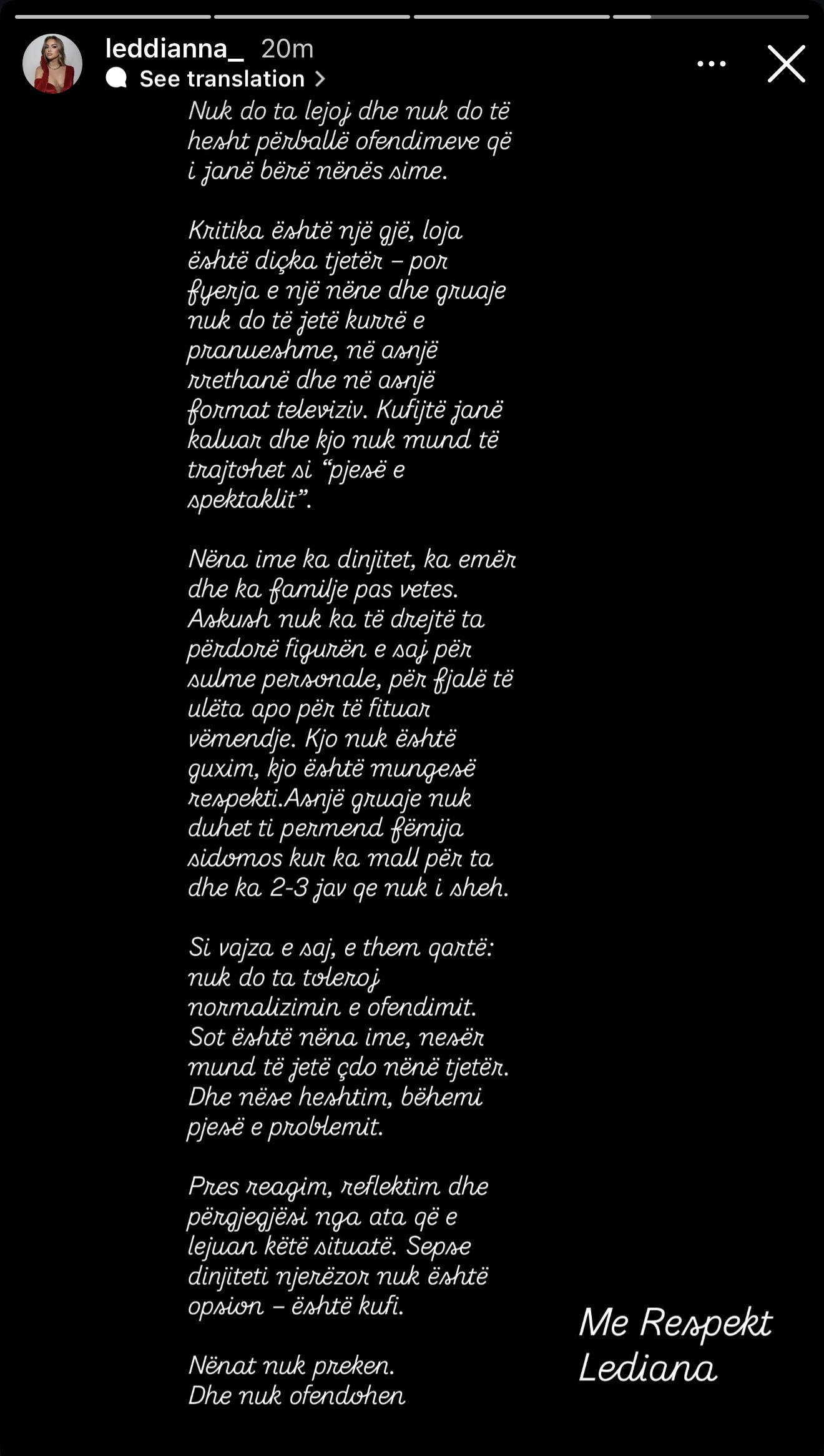 Lediana, vajza e këngëtares Fjolla Morina, ka thyer heshtjen përmes një postimi në rrjetin social Instagram, pas debateve të forta që nëna e saj pati me dy banoret e tjera, Albën dhe Shkurtën.