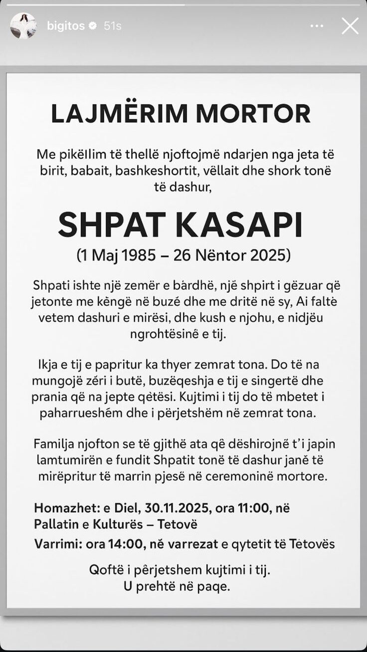 Me pikëllim të thellë, komuniteti artistik dhe familja Kasapi njoftojnë se nesër (e Diel, 30 Nëntor) do t’i jepet lamtumira e fundit këngëtarit të dashur, Shpat Kasapi, i cili u nda nga jeta në moshën 40-vjeçare, më 26 Nëntor 2025.