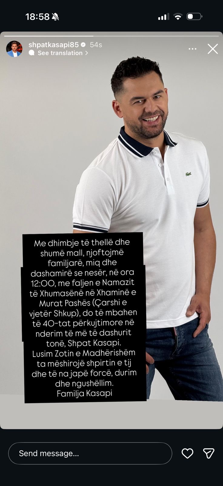 Familja e këngëtarit të mirënjohur shqiptar, Shpat Kasapi, ka njoftuar përmes llogarisë së tij zyrtare në Instagram mbajtjen e ceremonisë përkujtimore të 40 ditëve nga ndarja e tij e parakohshme nga jeta.