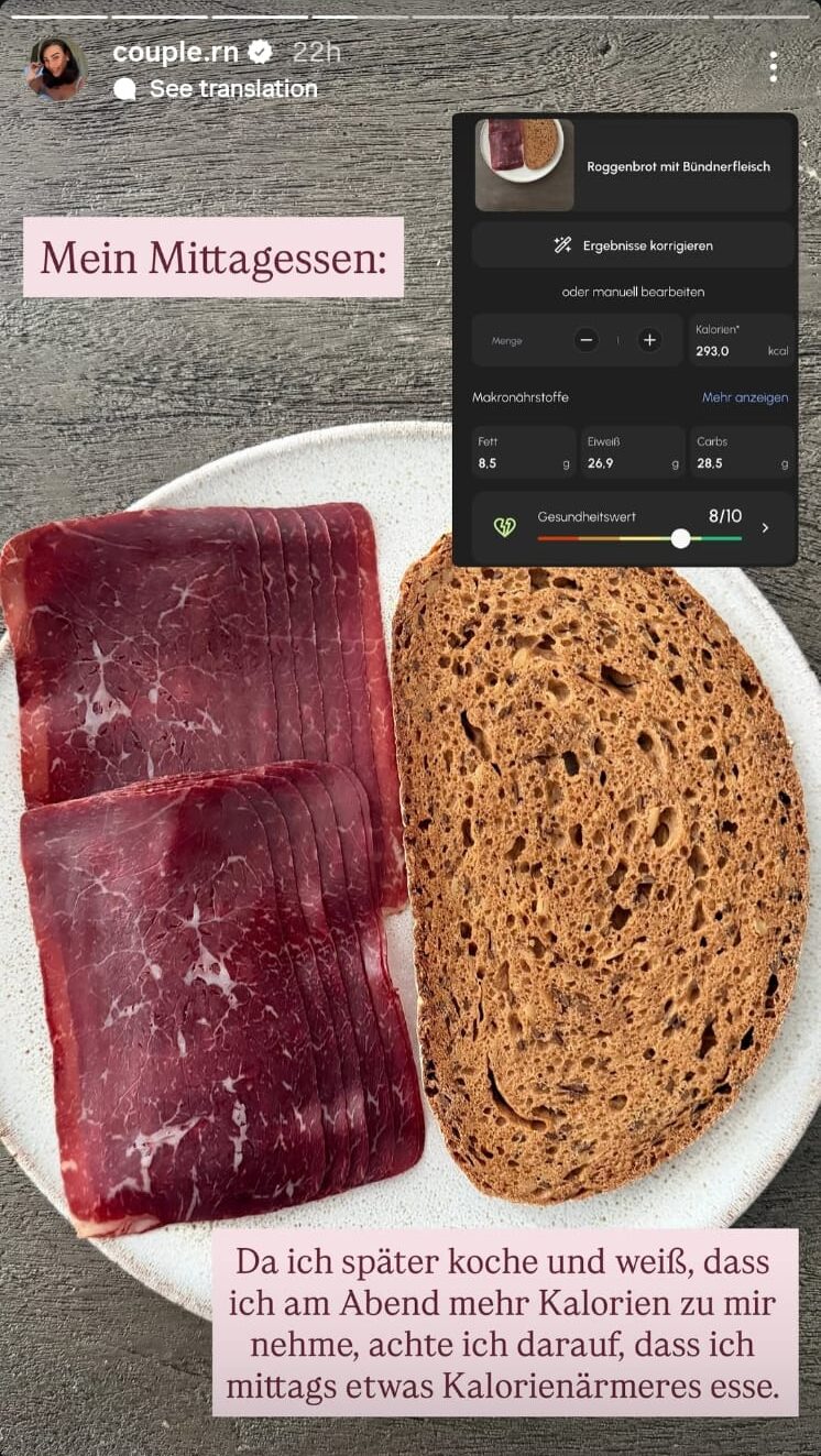 Ajo tregoi një vakt të përbërë nga bukë thekre dhe mish i thatë, të cilin e kishte llogaritur me saktësi absolute në një aplikacion ushqimi: vetëm 293 kalori në total, me një bilanc perfekt prej 26.9 gramë proteinash.