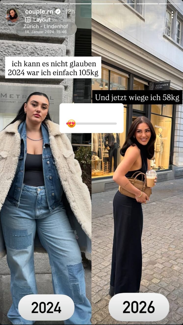 Në janar të vitit 2024, Njomza tregon se peshonte 105 kilogramë, ndërsa sot, në vitin 2026, ajo ka arritur peshën e jashtëzakonshme prej 58 kilogramësh. Një rënie prej plot 47 kilogramësh në harkun kohor të dy viteve!
