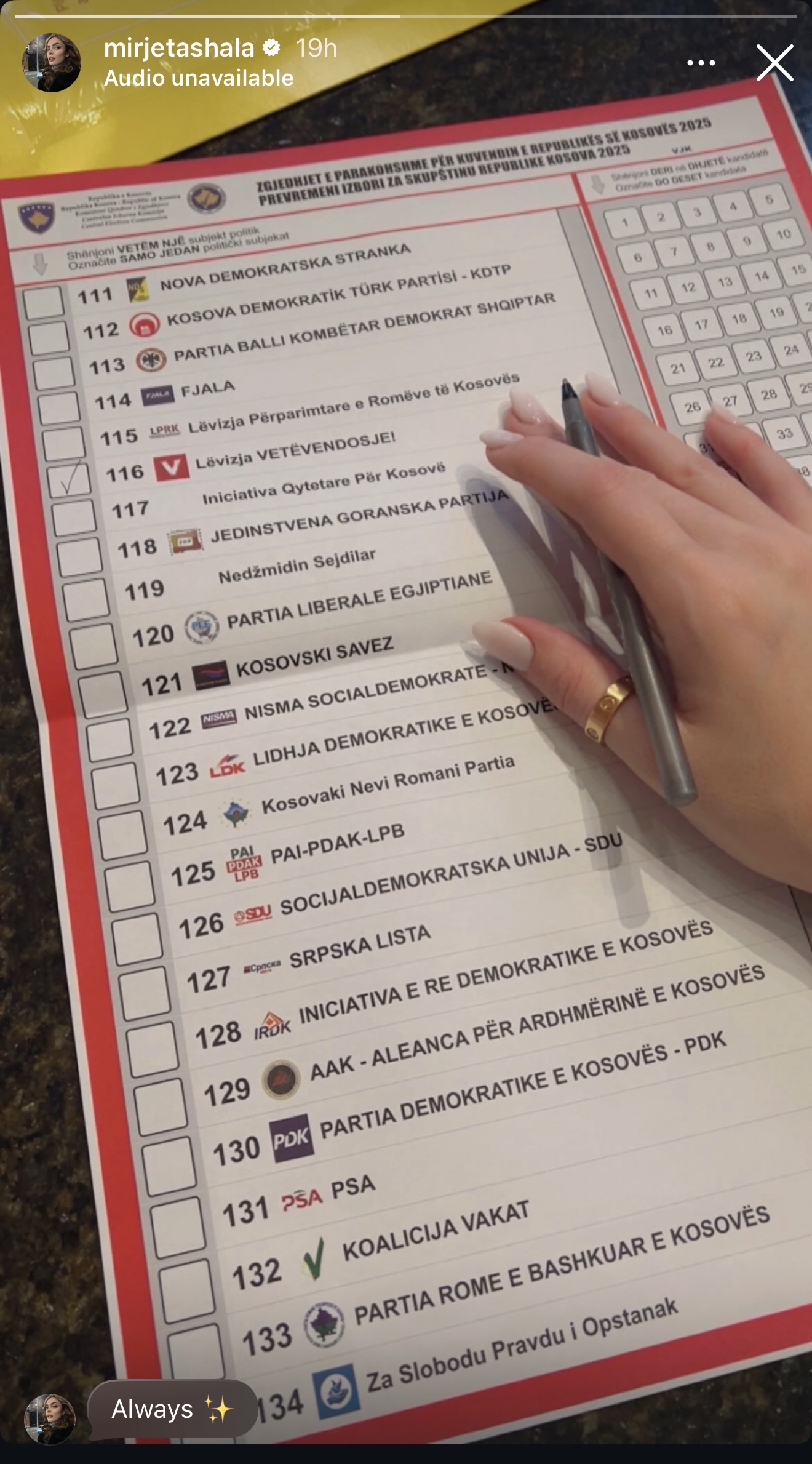 Prej vitesh ajo jeton në Shtetet e Bashkuara të Amerikës, por kjo nuk e ka penguar që të jetë pjesë e procesit zgjedhor përmes postës. Në fotografinë e shpërndarë me ndjekësit e saj në rrjetet sociale, shihet qartë fletëvotimi ku ajo ka zgjedhur Lëvizjen Vetëvendosje, përkatësisht numrin 116.