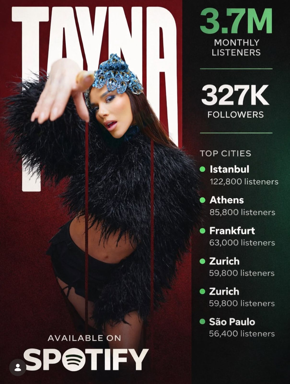 Artistja e cila ka dominuar skenën shqiptare prej vitesh, tashmë ka zyrtarizuar statusin e saj si një yll global, duke regjistruar një rekord absolut në platformën gjigante Spotify. Me 3.7 milionë dëgjues mujorë dhe një ushtri besnike prej mbi 327 mijë ndjekësish në këtë platformë, Tayna jo vetëm që kryeson listat, por po ri-përcakton se çfarë do të thotë sukses digjital për një artiste nga trojet tona.