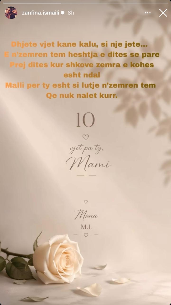 Zanfina përmes vargjeve ka shprehur dhimbjen e thellë. Ajo ka ndarë një imazh me një trëndafil të bardhë, shoqëruar me fjalët: “Dhjetë vjet kanë kalu, si një jetë… E n’zemrën tem heshtja e ditës së parë. Prej ditës kur shkove zemra e kohës është ndal. Malli për ty është si lutje n’zemrën tem që nuk nalet kurr. 10 vjet pa ty, Mami. Mona M.I.”