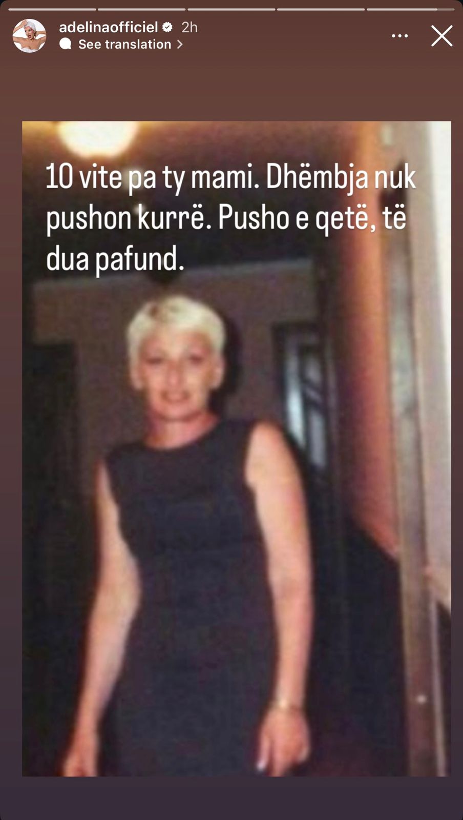 Nga ana tjetër, Adelina ka kujtuar nënën e saj përmes një fotografie të vjetër të Monës, duke e shoqëruar me një mesazh të shkurtër por shumë të ndjerë. “10 vite pa ty mami. Dhimbja nuk pushon kurrë. Pusho e qetë, të dua pafund,” ka shkruar diva e muzikës shqiptare në InstaStory.