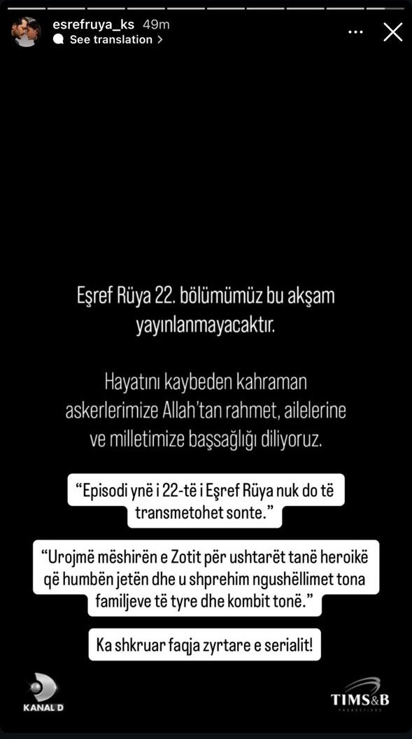 Seriali turk “Eşref Rüya” nuk do të transmetojë episodin e ri sonte, dhe tashmë është bërë e qartë arsyeja zyrtare e kësaj shtyrje.