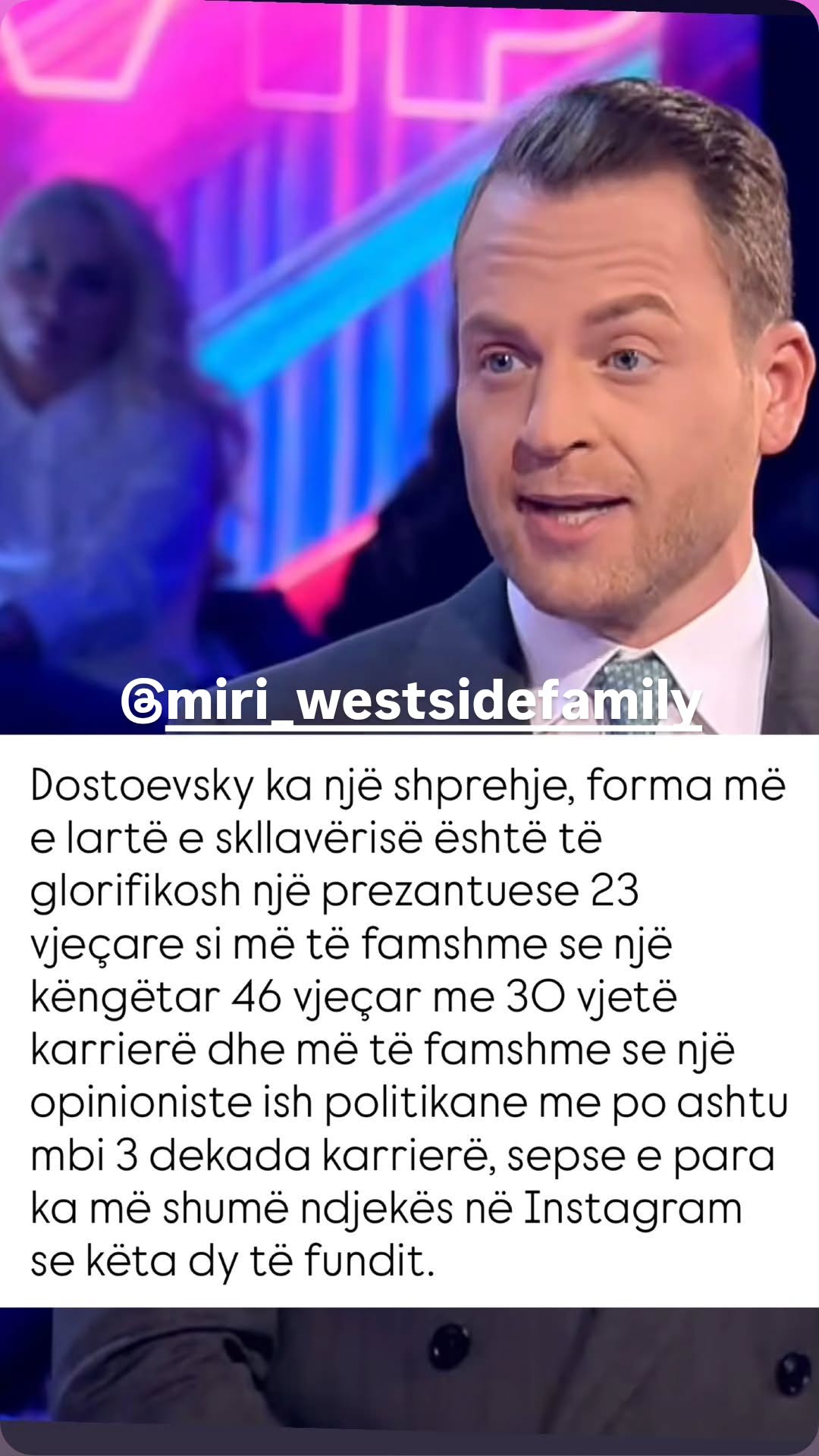 Ajo ka postuar një foto të Ledionit gjatë spektaklit, të shoqëruar me tekstin goditës: “Forma më e lartë e skllavërisë është të glorifikosh një prezantuese 23 vjeçare si më të famshme se një këngëtar 46 vjeçar me 30 vjet karrierë dhe më të famshme se një opinioniste ish politikane me po ashtu mbi 3 dekada karrierë, sepse e para ka më shumë ndjekës në Instagram se këta dy të fundit”.