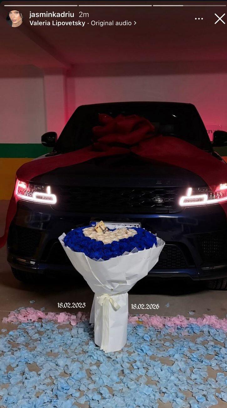 Jasmina ka ndarë me ndjekësit e saj pamje nga surpriza që partneri i ka përgatitur për këtë datë speciale. Në qendër të vëmendjes ishte një makinë luksoze e tipit Range Rover, e mbuluar me një fjuban të madh të kuq. Ambienti ishte dekoruar deri në detaje me petale rozë dhe blu, ndërsa në plan të parë qëndronte një buqetë gjigante me trëndafila blu dhe të bardhë, ku ishin shënuar datat domethënëse: 18.02.2025 – 18.02.2026.