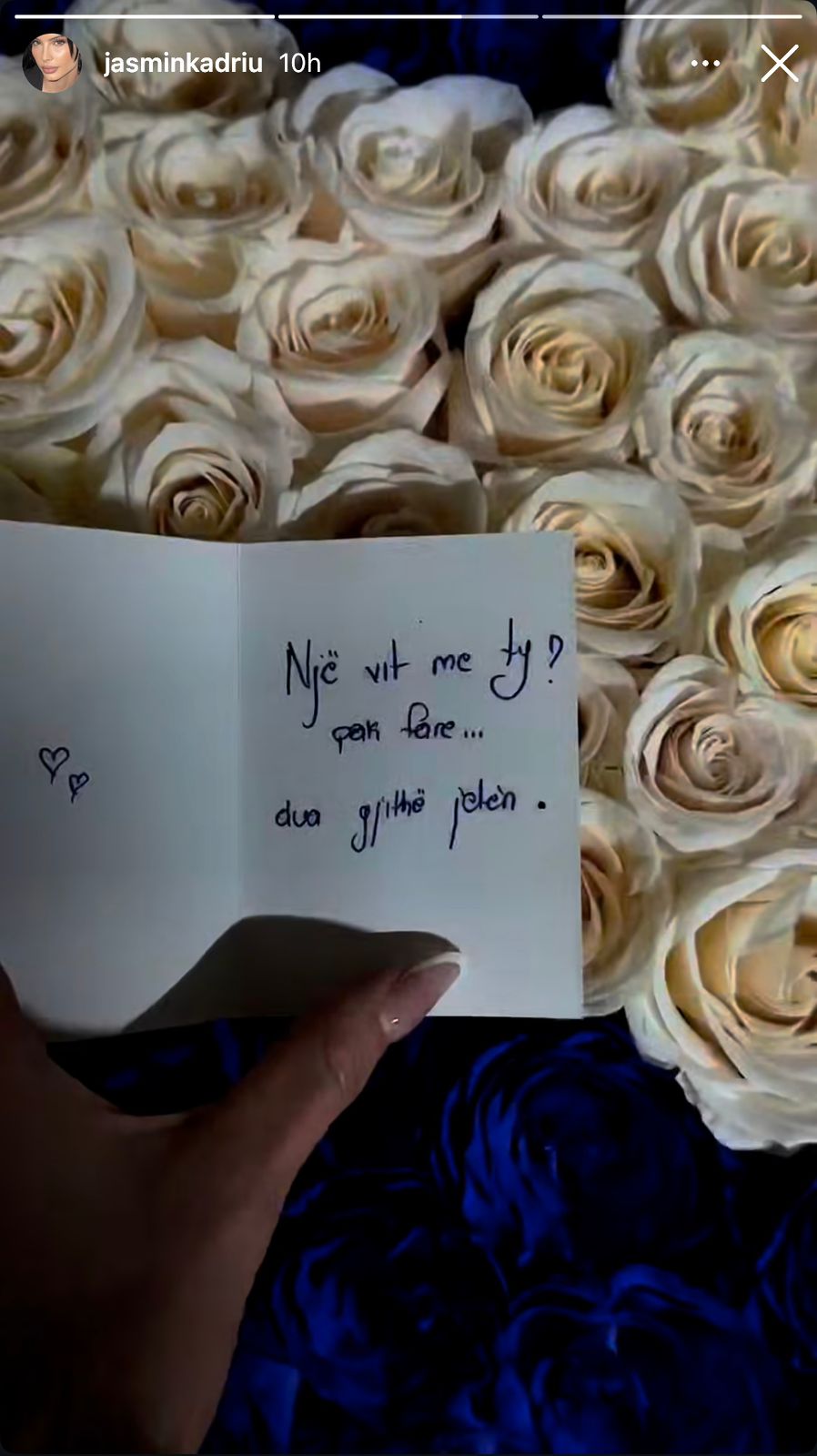 Përveç dhuratave luksoze, vëmendjen e mori edhe një kartolinë e shkruar me dorë, e cila mbarte një mesazh mjaft romantik. “Një vit me ty? Pak fare… dua gjithë jetën,” shkruhej në shënimin që Jasmina e ndau, duke treguar se kjo marrëdhënie është serioze dhe se çifti ka plane afatgjata me njëri-tjetrin.