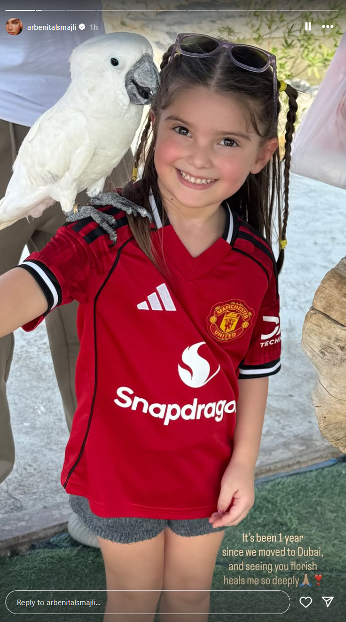 “U bë një vit që u zhvendosëm në Dubai, dhe të shoh ty të rritesh e të lulëzosh më shëron aq thellë”, ka shkruar Arbenita, duke iu referuar vajzës së saj.