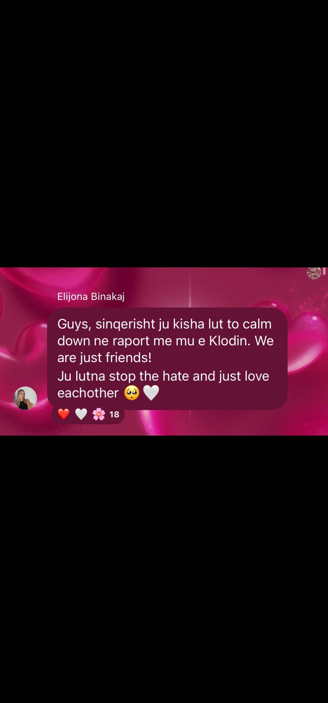 Përmes një mesazhi të drejtpërdrejtë në grupin e saj me fansat në Instagram, ajo ka vendosur të qartësojë njëherë e mirë situatën dhe të kërkojë mirëkuptim. “Njerëz, sinqerisht do t’ju lutesha të qetësoheshit në raport me mua dhe Klodin. Ne jemi thjesht miq! Ju lutem ndaleni urrejtjen dhe thjesht duani njëri-tjetrin 🥺🤍,” ka shkruar Elijona, duke tentuar t’i japë fund aludimeve të vazhdueshme.