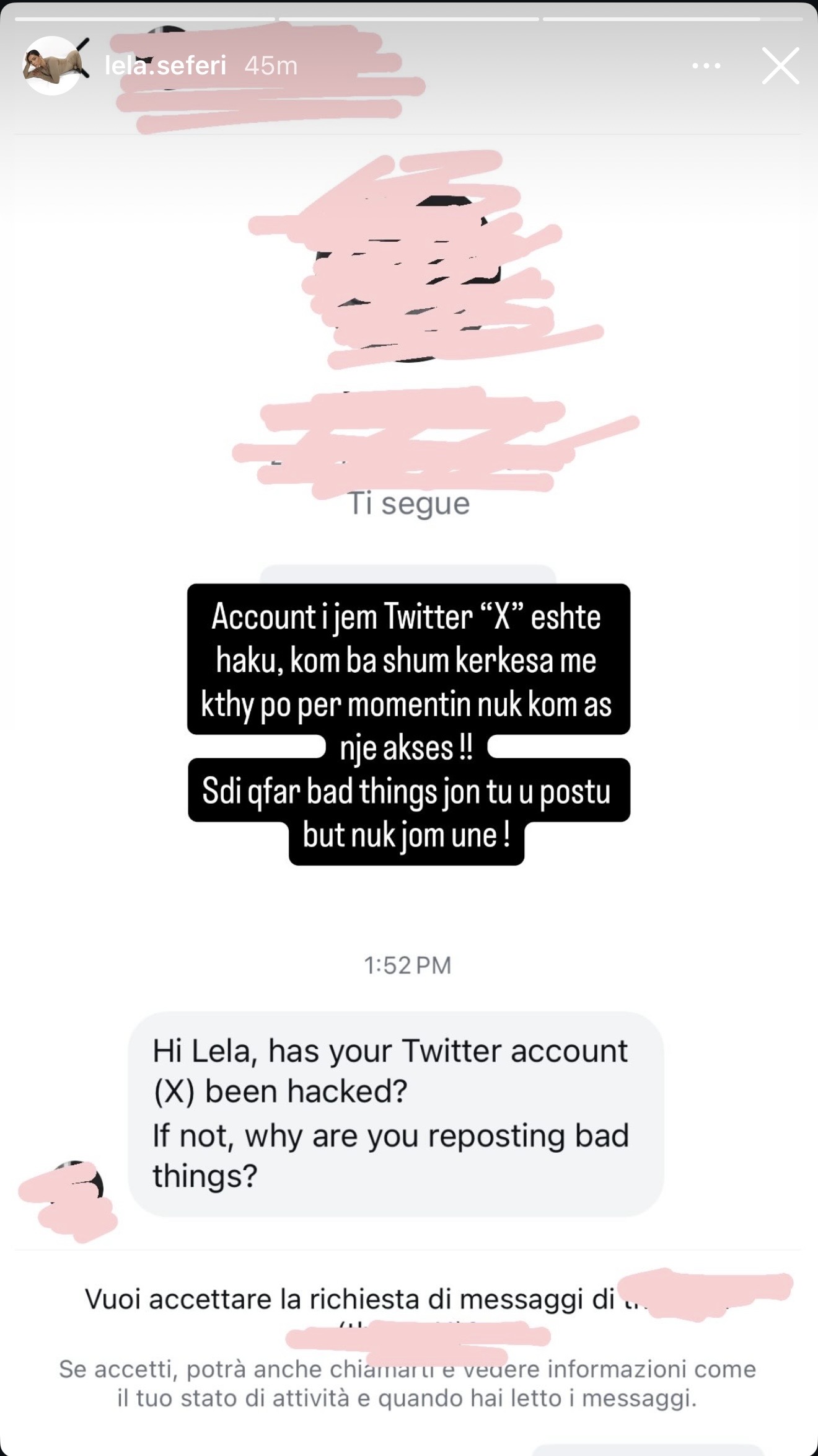 Ish-banorja e “Big Brother VIP Kosova”, Lela Seferi, ka njoftuar ndjekësit e saj se llogaria e saj personale në platformën “X” (ish-Twitter) është hakuar.