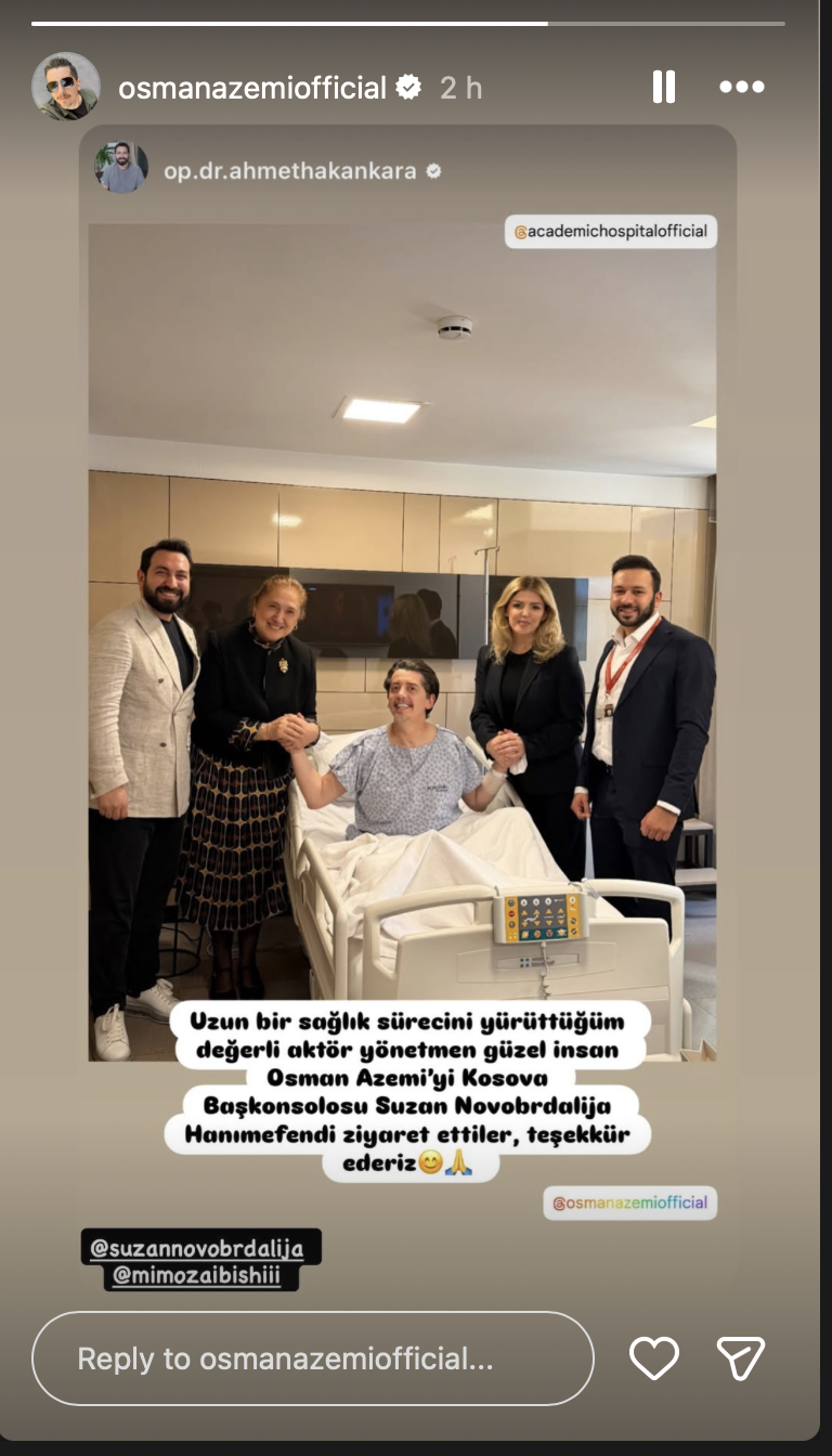 Gjatë ditës së sotme, aktori ka ndarë me publikun një moment emocionues nga spitali, ku ai është vizituar nga Konsullja e Përgjithshme e Kosovës në Stamboll, Suzan Novobërdaliu, e shoqëruar nga stafi tjetër.