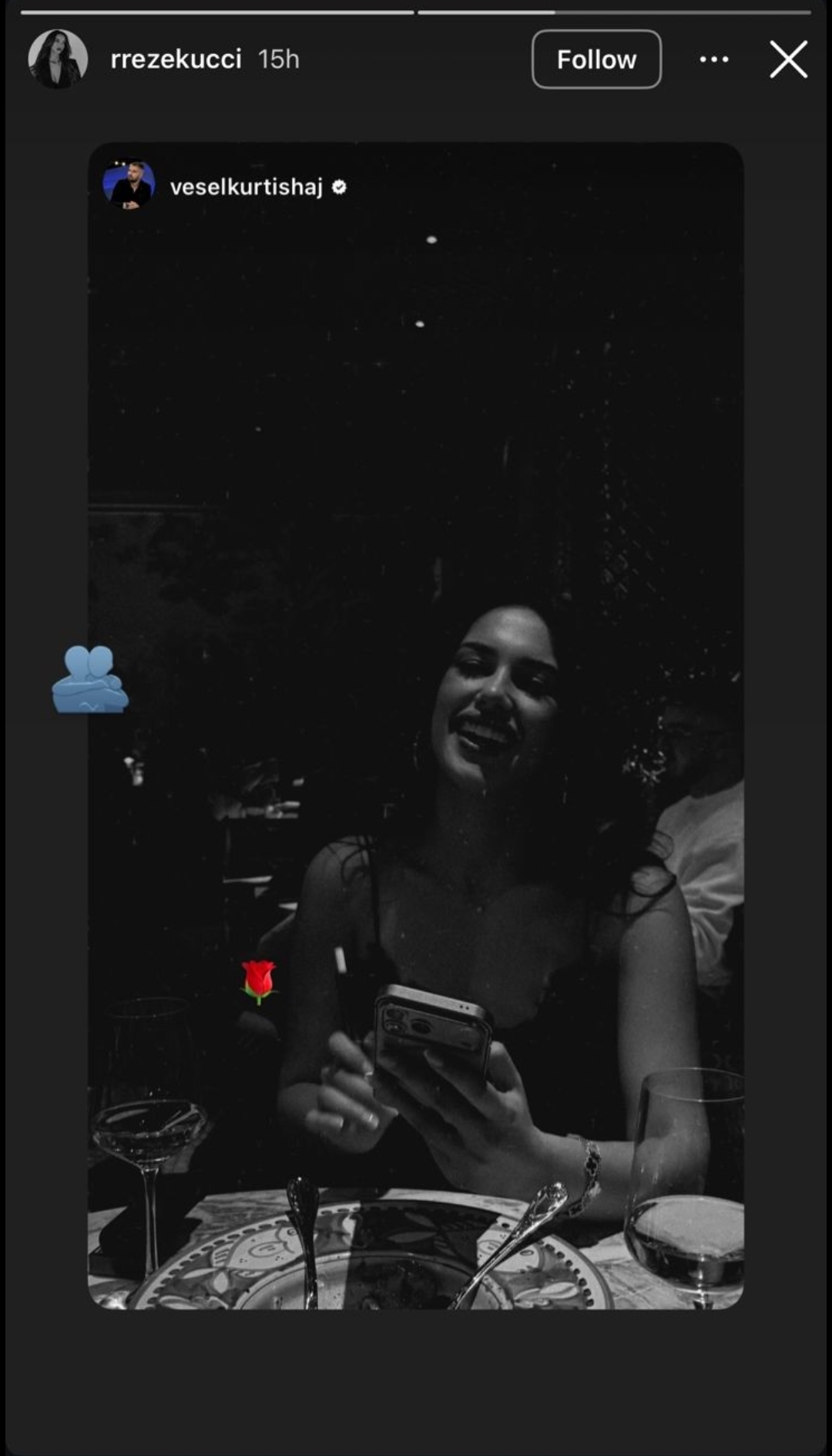Përmes një postimi në Instagram Story, Veseli ndau një foto bardh e zi të një vajze duke shijuar një darkë romantike, të cilën e shoqëroi minimalistisht vetëm me një emoji trëndafili të kuq. Edhe pse ai u mundua të tregohej diskret duke mos e bërë tag, misteri u zgjidh shumë shpejt.