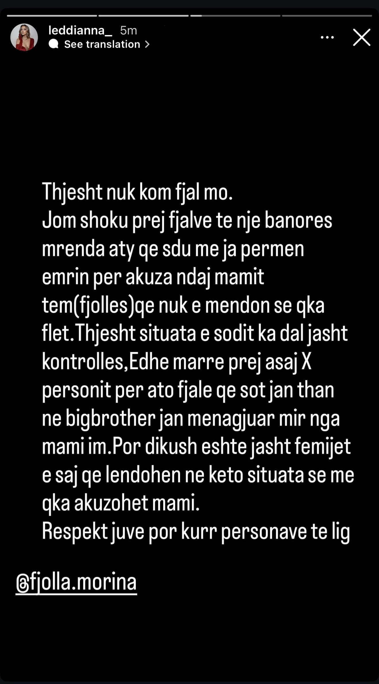 Përmes një postimi në rrjetet sociale, ajo u shpreh e tronditur nga fjalët e drejtuara ndaj nënës së saj prej një banoreje tjetër, emrin e së cilës refuzoi ta përmendte.