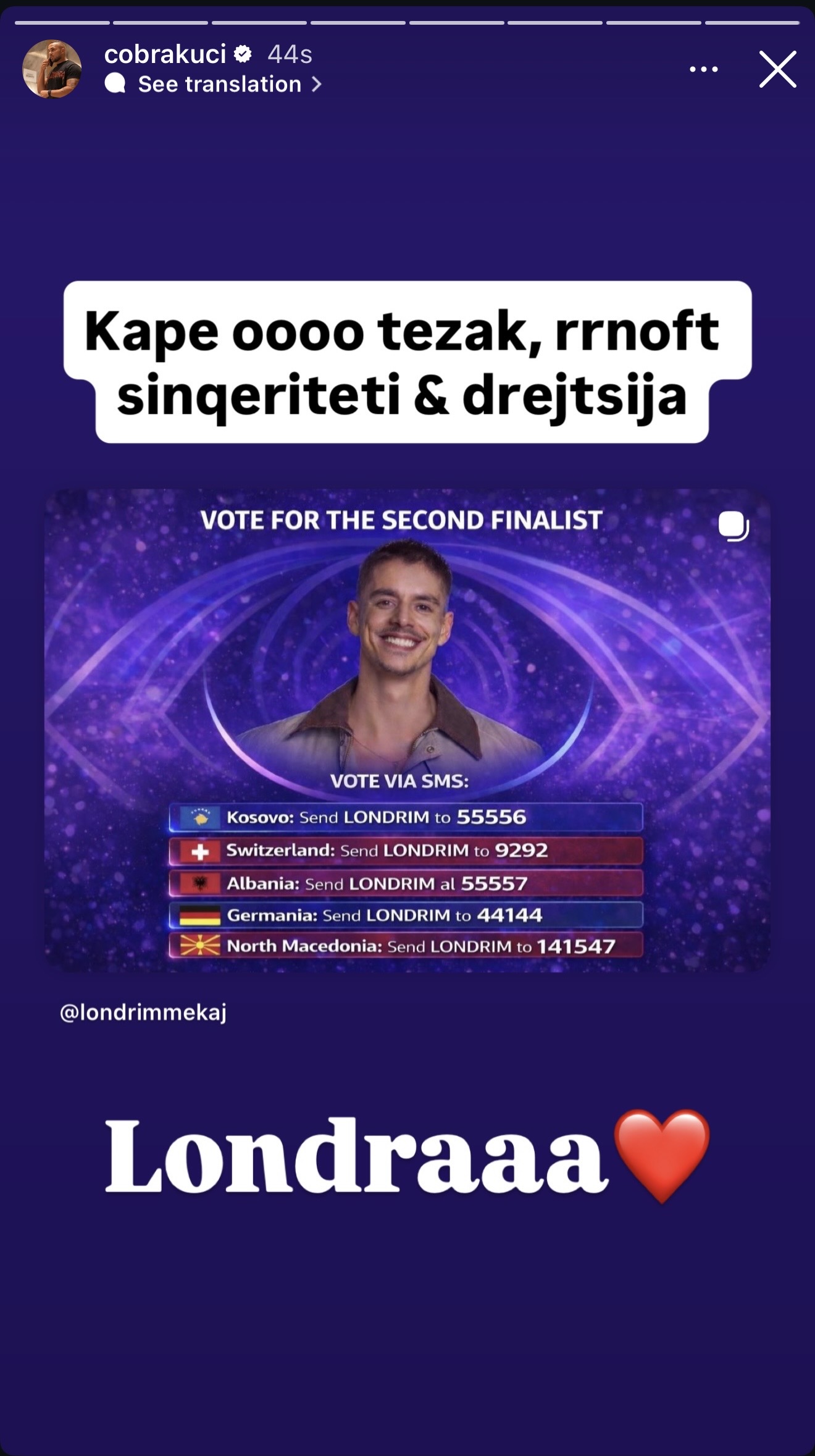 Përmes një postimi të ri, ai ka bërë thirrje për ta votuar Londrimin si finalistin e dytë, duke treguar kështu një mbështetje të dyfishtë për garën e ethshme drejt çmimit të madh.