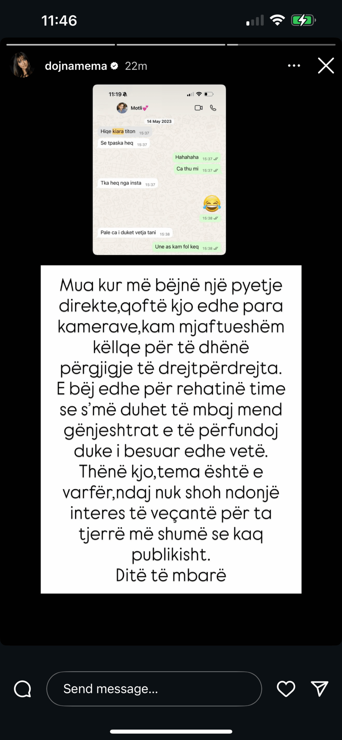 Moderatorja ka publikuar një bisedë private në WhatsApp, ku motra e saj i shkruan “Hiqe Kiara Titon, se t’paska heq nga Instagrami”, ndërsa më pas Dojna i përgjigjet: