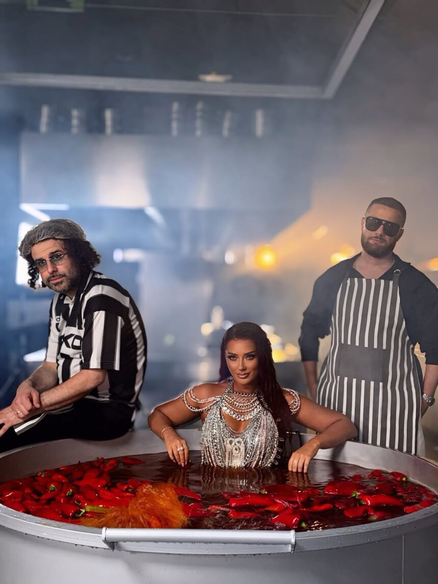 Këngëtarja ka ndarë në Instagram një foto që ka tërhequr menjëherë vëmendjen e publikut: Ronela shihet brenda një ene të madhe plot me speca të kuq, ndërsa pranë saj qëndrojnë dy reperët, të veshur si “shefa kuzhine”. Postimi është shoqëruar me mbishkrimin:
