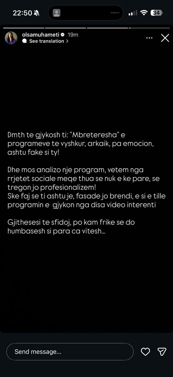 “Dmth të gjykosh ti: ‘Mbretëresha’ e programeve të vyshkur, arkaik, pa emocion, ashtu fake si ty! Dhe mos analizo një program vetëm nga rrjetet sociale… se tregon jo profesionalizëm.”