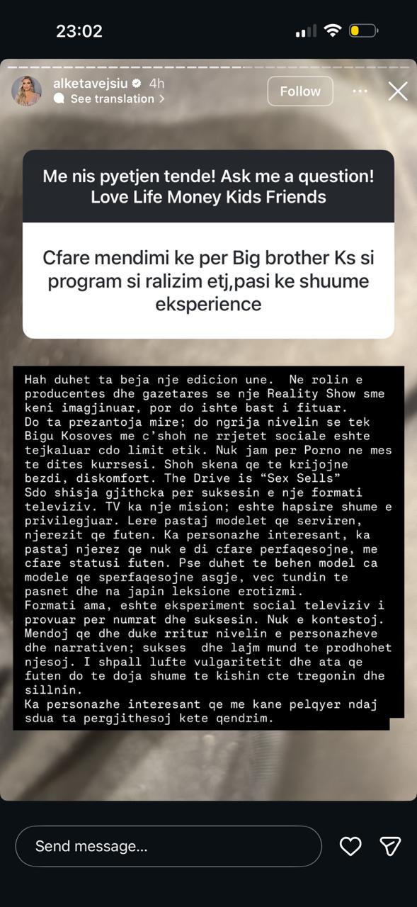 Gjatë një bashkëbisedimi me ndjekësit, Alketa Vejsiu nuk i ka kursyer kritikat e rënda ndaj formatit që drejtohet nga Olsa Muhameti. E pyetur për mendimin e saj, ajo e ka cilësuar “Big Brother VIP Kosova” si një tejkalim të çdo limiti etik: