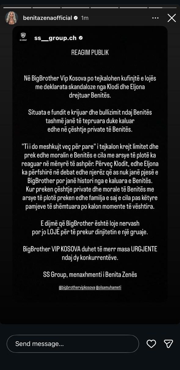 Përmes një postimi zyrtar nga “SS Group”, ata kanë dënuar atë që e cilësojnë si bullizëm dhe kalim të kufijve të lojës nga ana e Klodit dhe Eljonës drejtuar Benitës.