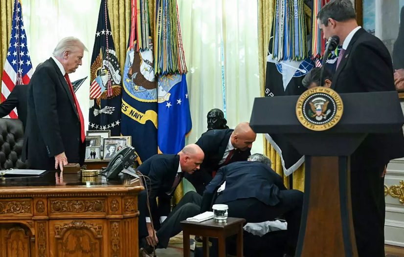Kjo nuk ishte e vetmja dramë e ditës. Gjatë të njëjtit takim, një ekzekutiv i industrisë farmaceutike u rrëzua papritur në Zyrën Ovale.
