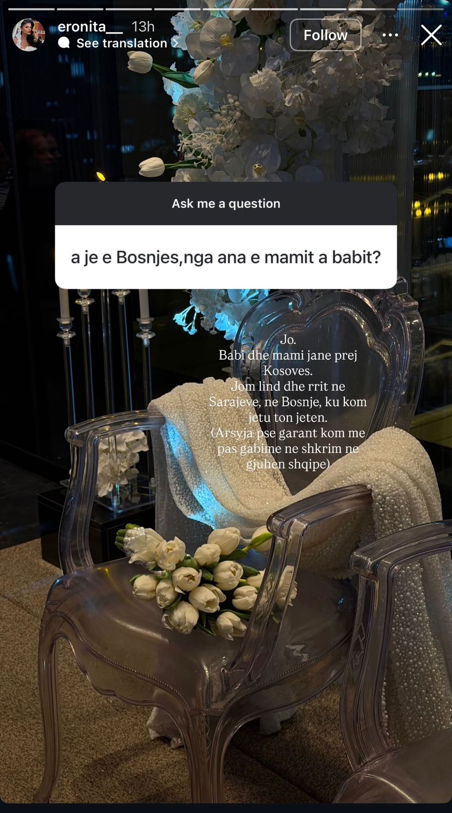 Përmes një komunikimi me ndjekësit në rrjetet sociale, Eronita ka sqaruar se ndonëse ka jetuar gjatë gjithë jetës në Bosnje, rrënjët e saj janë plotësisht shqiptare. Ajo tregoi se të dy prindërit e saj janë nga Kosova, duke shuar kështu kuriozitetin e shumë komentuesve që aludonin për një prejardhje tjetër.