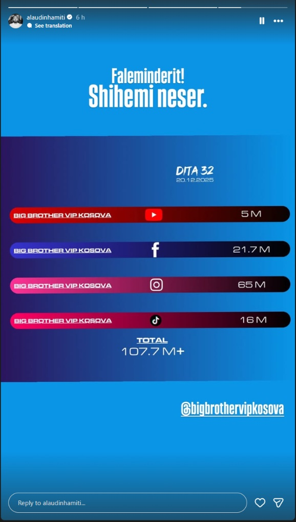 Sipas të dhënave të publikuara në profilin e tij zyrtar në Instagram, vetëm brenda 24 orëve të fundit, formati ka gjeneruar një total prej 107.7 milionë+ shikimesh në të gjitha platformat sociale.