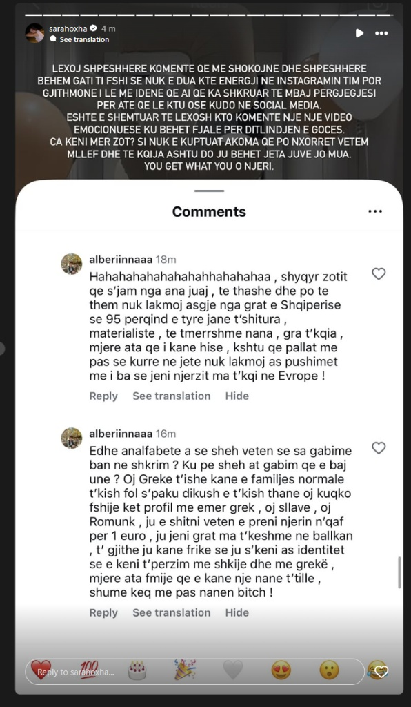 Në komentet e bëra publike, ndjekësja shpërthen në gjuhë urrejtjeje ndaj grave të Shqipërisë, duke i etiketuar ato si “të shitura”, “materialiste” dhe “gratë më të këqija në Evropë”. Por mllefi nuk ndalet me kaq. Ajo vazhdon duke sulmuar identitetin e Sarës me terma si “greke”, “sllave”, “romune” dhe epitete fyese, duke degraduar deri në ofendime për rolin e saj si nënë, me pretendimin absurd se “fëmijët që kanë një nënë të tillë janë për t’u mëshiruar”.