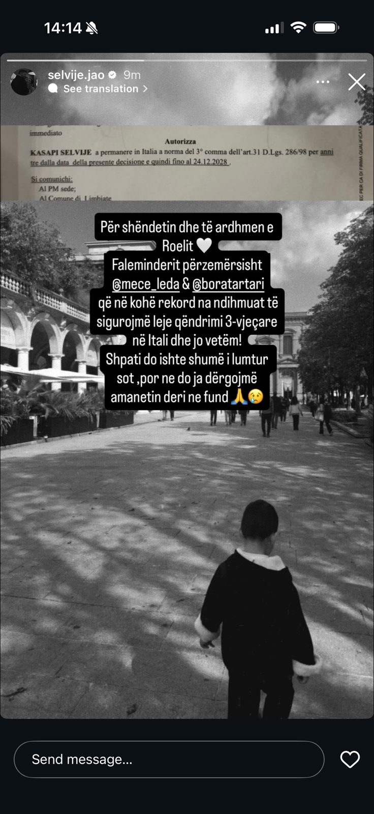 “Për shëndetin dhe të ardhmen e Roelit. Faleminderit përzemërsisht që në kohë rekord na ndihmuat të sigurojmë leje qëndrimi 3-vjeçare në Itali dhe jo vetëm!” – ka shkruar Selvija, duke falënderuar personat që e asistuan në këtë proces.