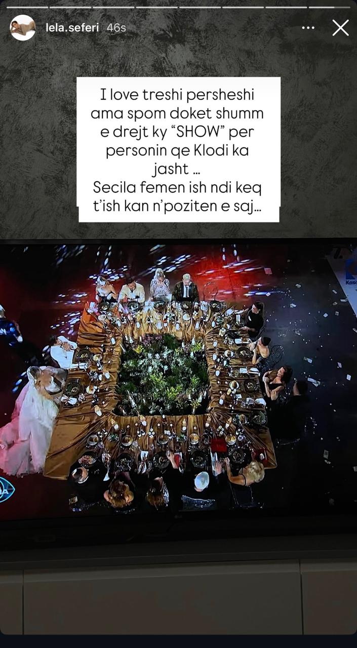 “I dua treshin përsheshin ama s’po m’doket shumë i drejtë ky ‘SHOW’ për personin që Klodi ka jashtë… Secila femër ish ndi keq t’ish kan n’pozitën e saj,” shkroi ajo, duke iu referuar të dashurës së Klodit që ka jashtë shtëpisë.