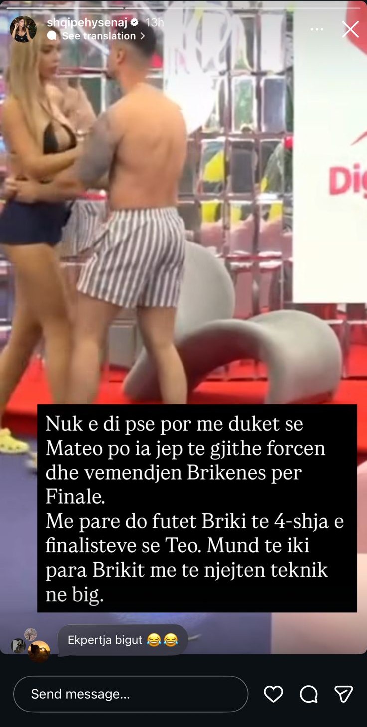 “Nuk e di pse por më duket se Mateo po ia jep të gjithë forcën dhe vëmendjen Brikenës për Finale. Më parë do futet Briki te 4-shja e finalistëve se Teo. Mund të iki para Brikit me të njëjtën teknikë në Big,” ka shkruar Shqipja në postimin e saj.