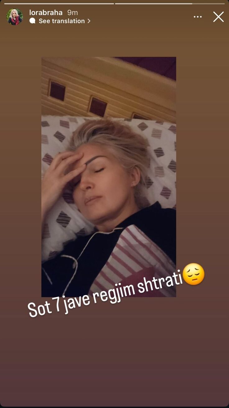 Në imazhin e publikuar, Lora shfaqet e shtrirë në krevat duke mbajtur dorën në ballë, e shoqëruar nga mbishkrimi: “Sot 7 javë regjim shtrati” dhe një emoji me fytyrë të trishtuar.