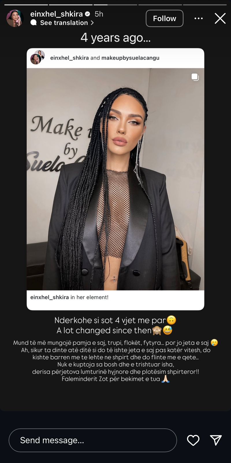 “Ndërkohë si sot 4 vjet më parë. Shumë gjëra kanë ndryshuar që atëherë. Mund të më mungojë pamja e saj, trupi, flokët, fytyra… por jo jeta e saj. Ah, sikur ta dinte atë ditë si do të ishte jeta e saj pas katër vitesh, do kishte barrën më të lehtë në shpirt dhe do flinte më e qetë… Nuk e kuptoja sa bosh dhe e trishtuar isha, derisa përjetova lumturinë hyjnore dhe plotësimin shpirtëror!! Faleminderit Zot për bekimet e tua.”