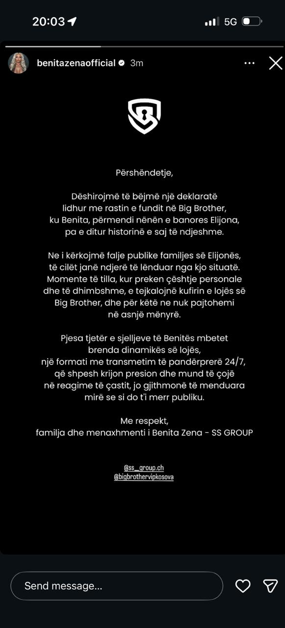 Pas zhurmës së madhe në rrjet, ka ardhur reagimi zyrtar nga jashtë. Familja dhe menaxhmenti i Benitës (SS Group) kanë publikuar një deklaratë në llogarinë e saj zyrtare në Instagram.