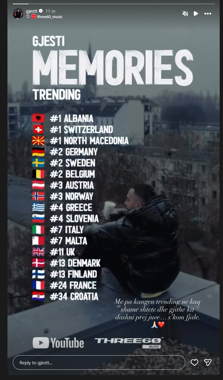 Kjo mbështetje e pakursyer është përkthyer në një sukses të jashtëzakonshëm në platformat digjitale, ku kënga po dominon listat “Trending” në mbarë Europën. Siç ka treguar vetë Gjesti përmes një postimi, balada mban vendin e parë absolut në Shqipëri, Zvicër dhe Maqedoninë e Veriut, ndërsa renditet ndër më të dëgjuarat në shtete si Gjermania, Suedia, Belgjika e deri në Mbretërinë e Bashkuar. Nuk bëhet fjalë vetëm për klikime, por për një solidarizim të paparë të fansave që kanë ndjerë dhimbjen e tij përmes notave muzikore.