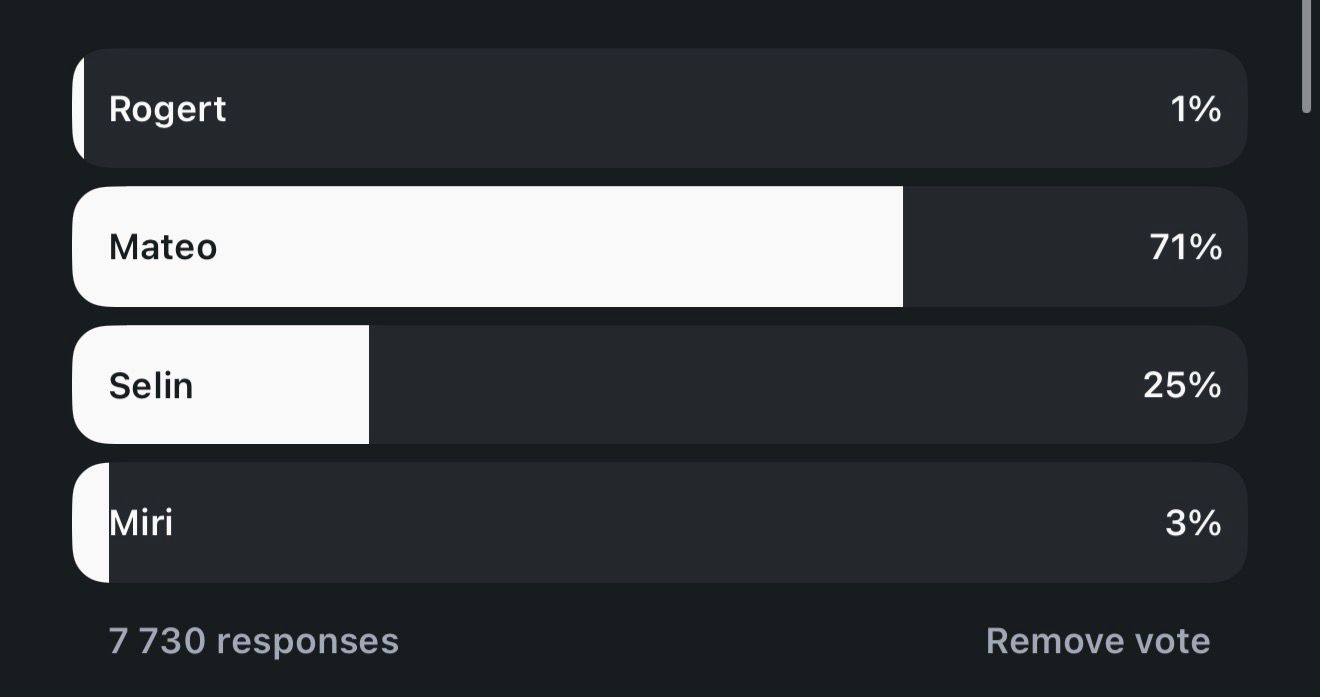 Këtë e tregon më së miri edhe sondazhi i hapur në Instagramin e Prive By Liberta Spahiu. Nga një kampion prej afro 8,000 votuesish (më saktësisht 7,730 përgjigje), Mateo doli bindshëm i pari duke rrëmbyer 71% të votave, ndërsa Selin mori 25%. Nga ana tjetër, ajo që vihet re menjëherë është përqindja thuajse e papërfillshme e dy finalistëve të tjerë. Miri grumbulloi vetëm 3%, ndërsa Rogerti mbeti në fund me 1%, duke u parë nga rrjeti si totalisht jashtë lojës për çmimin e parë.