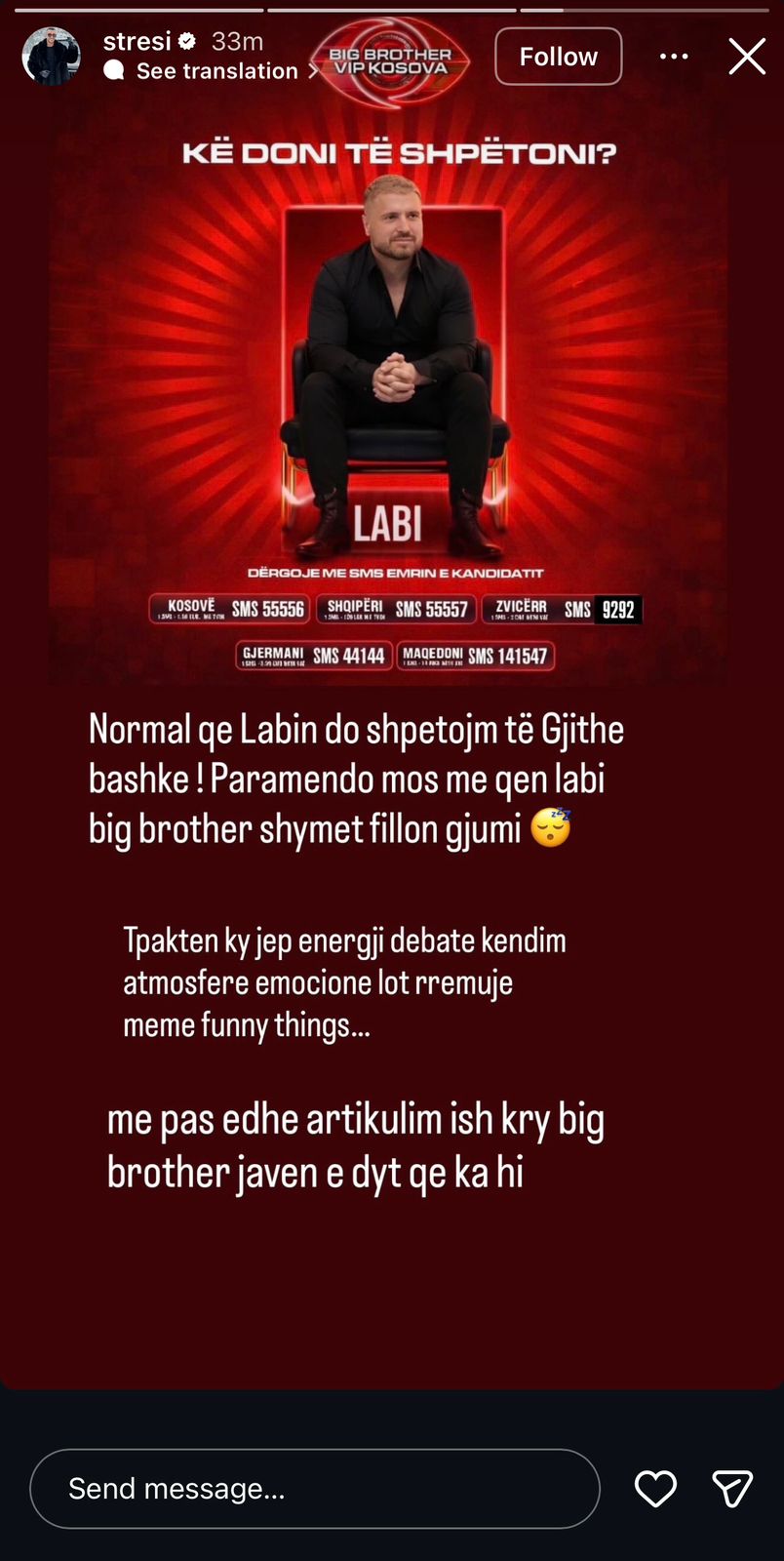 “Normal që Labin do e shpëtojmë të gjithë bashkë! Paramendo mos me qenë Labi, Big Brother fiket, fillon gjumi. Të paktën ky jep energji, debate, këndim, atmosferë, emocione, lot, rremujë, meme, funny things… Me pas edhe artikulim, ishte bërë krye Big Brother javën e dytë që ka hyrë,” ka shkruar Stresi në postimin e tij, duke vlerësuar dinamikën që Labi i sjell lojës.