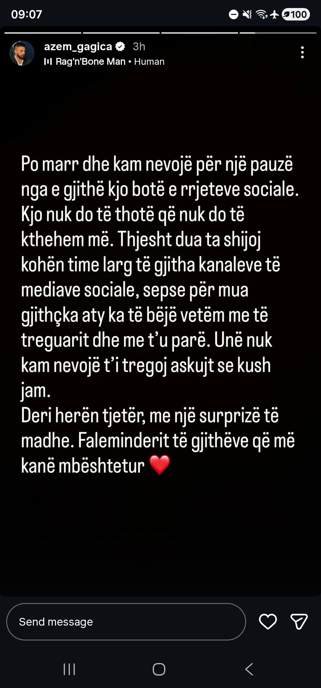 Para se të bënte “pastrimin” e madh të llogarisë, Azemi la një mesazh të fundit shpjegues, duke sqaruar se kjo nuk është thjesht një tekë momenti, por një nevojë urgjente për t’u shkëputur nga presioni i dukjes. Ai u shpreh hapur se bota e rrjeteve sociale është kthyer në një mjedis toksik ku “gjithçka ka të bëjë vetëm me të treguarit dhe me t’u parë”, duke shtuar me bindje se në këtë fazë të jetës, ai nuk ndjen më nevojën t’i dëshmojë askujt se kush është realisht.