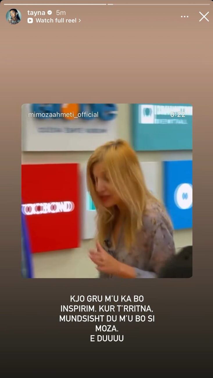 Përmes një postimi në llogarinë e saj në Instagram, Tayna ka shpërndarë një video të Mimozës, duke i bashkangjitur disa fjalë me plot admirim. Reperja nuk i ka kursyer vlerësimet për natyrën e lirë, unike dhe krejtësisht pa filtra të poetes.