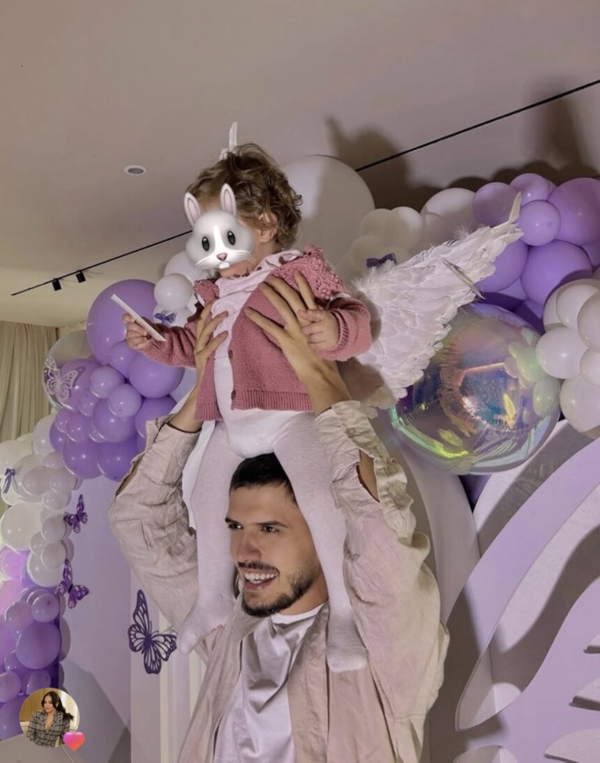 Këngëtari Bardhi ndau një foto të ëmbël ku shihet duke mbajtur Nean mbi supe, e veshur si engjëll, në mes të një dekorimi me tullumbace vjollcë.