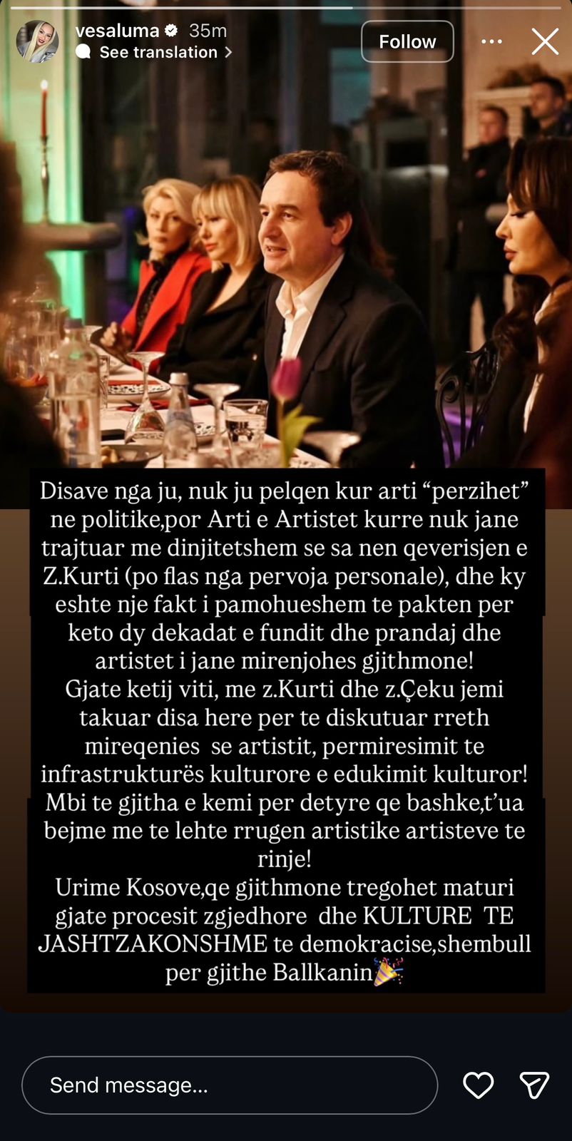 Përmes një postimi në Instagram Story, ajo ka ndarë një imazh ku shihet krah Kryeministrit Albin Kurti, duke e shoqëruar me një tekst të gjatë plot vlerësim.
